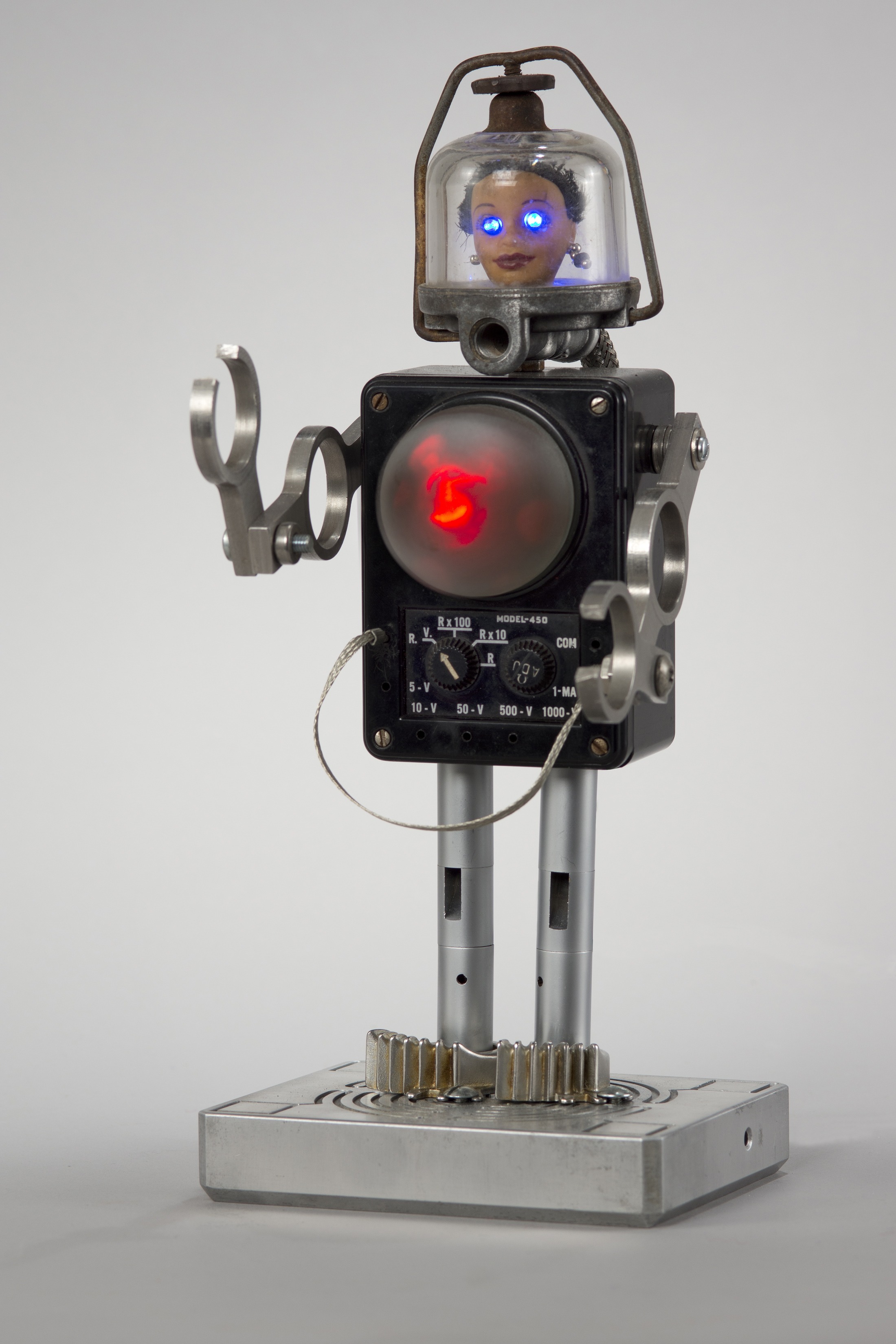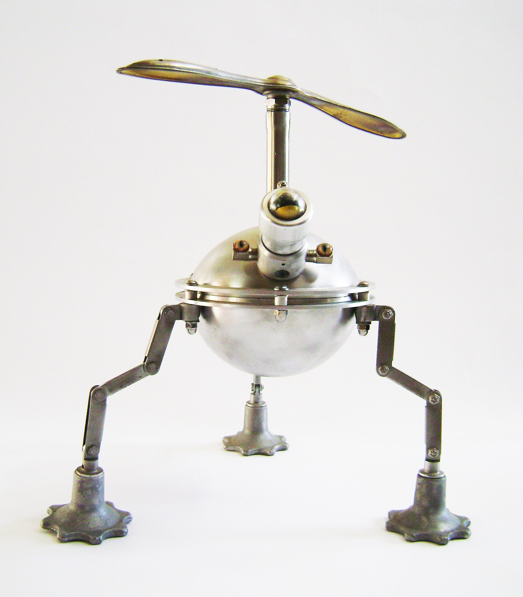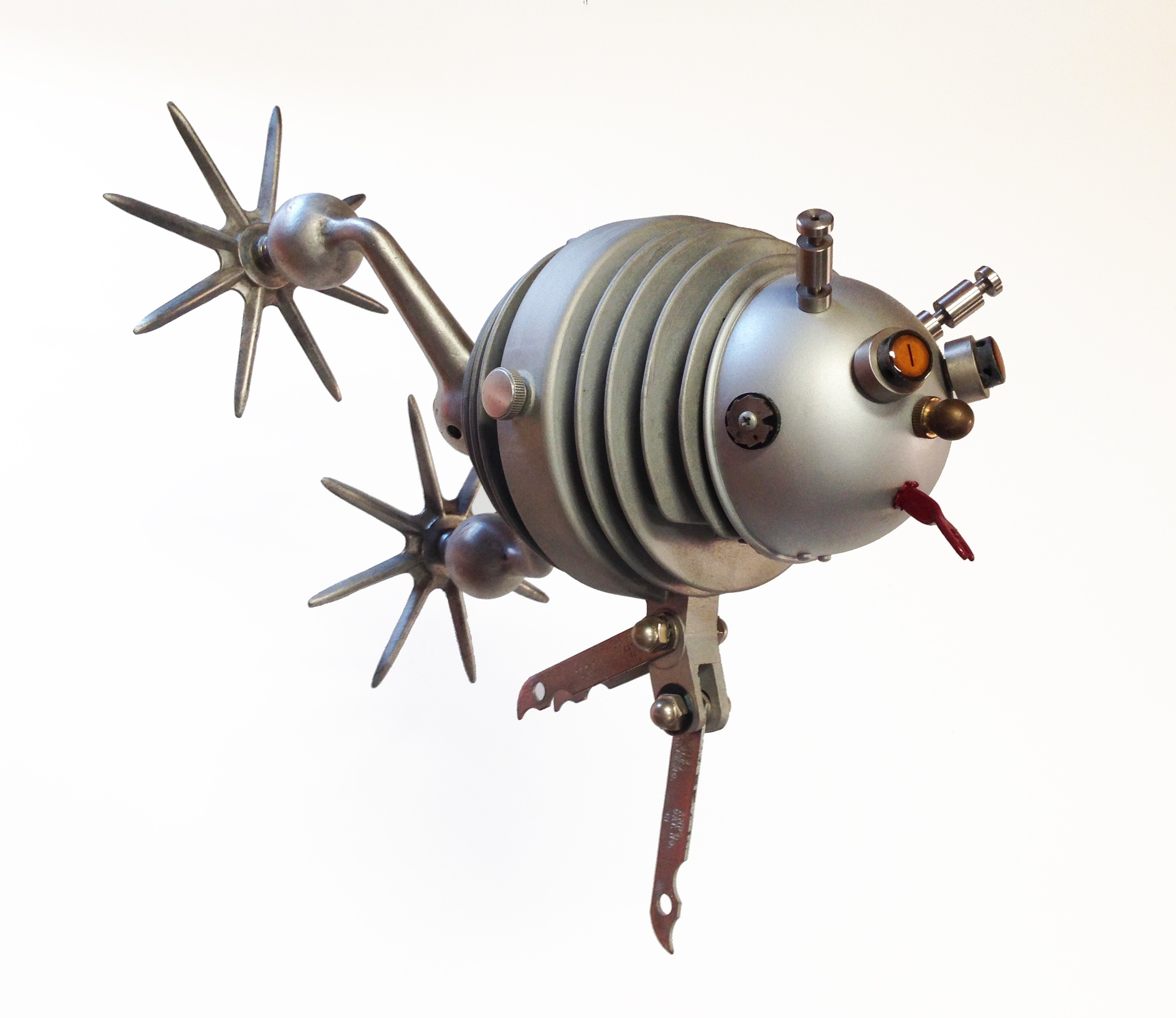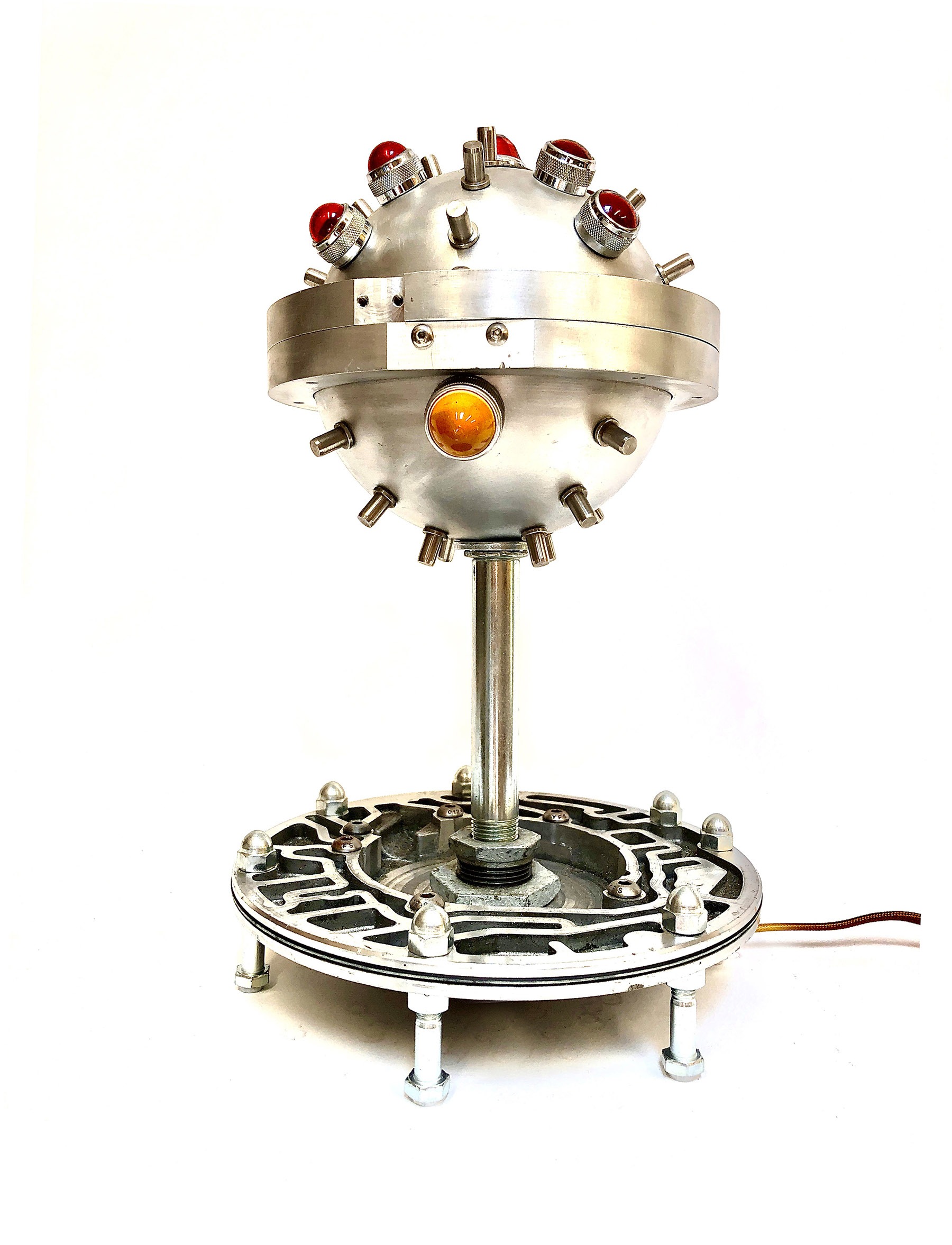 A piece begins with a shape that may remind me of a robot head, a rocketship, the body part of a creature or simply a beautiful base for a lamp. Assembling the rest of the components is almost like putting together a puzzle, trying out different pieces until I get something I consider a nice combination of parts.”