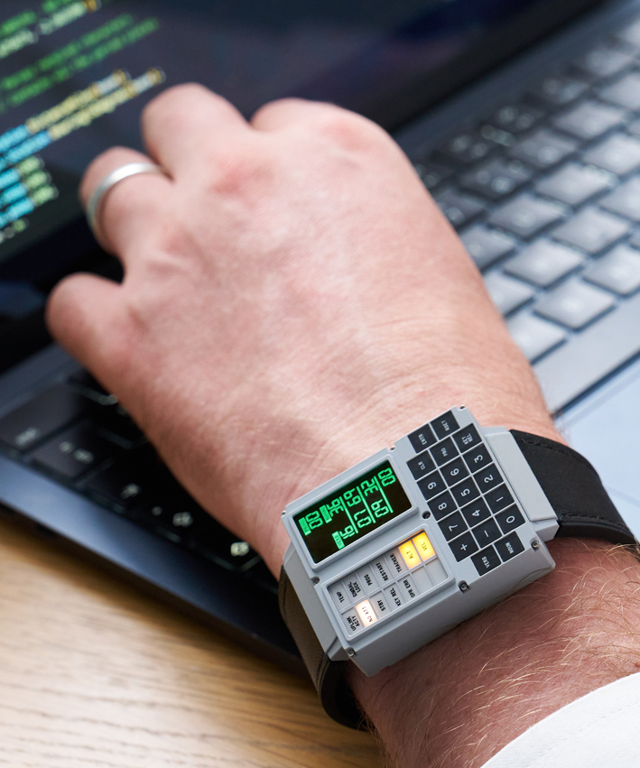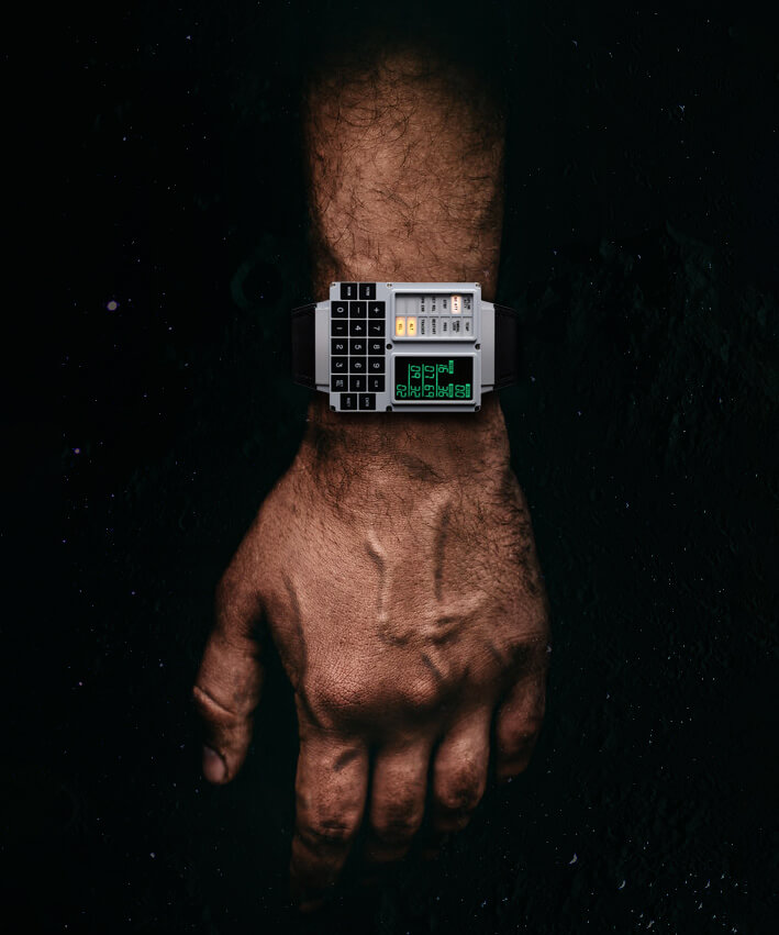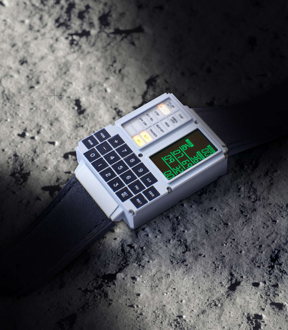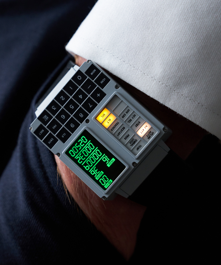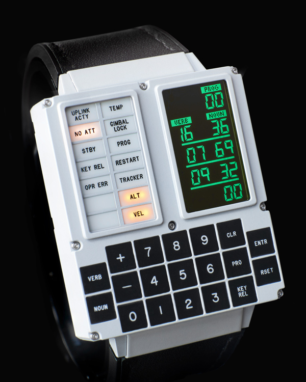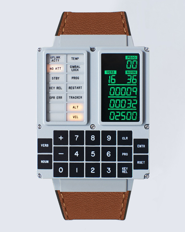 Called the DSKY Moonwatch, it is modeled after the guidance computer interface, and includes stopwatch, GPS navigation, and of course, a clock. It features a CNC-machined stainless steel case, OLED display, and a leather band.